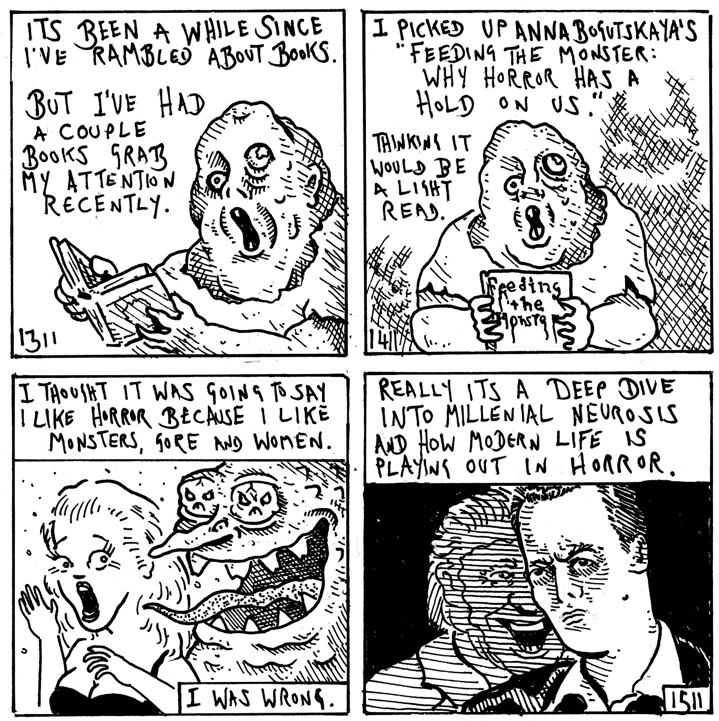 The Wrong comics are anthologies of short standalone pieces with no clear theme of throughline between them. Generally I draw one story at a time without rushing or forcing it in any which way. At some point in 2024 I read “Feeding The Monster” by Anna Bogutskaya. A book about what horror means to us and why we can’t leave it alone. I’ve already wrote about this book in Squareface Diaries Issue 3 (my true naval gazing daily journal comic)