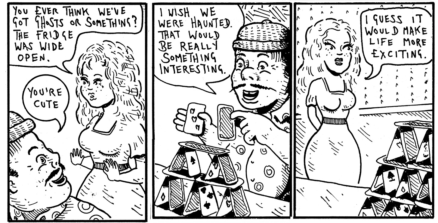 If Wrong 2 has a theme it’s repression and a misguided search for the paranormal. I’m a true believer in whatever you repress now will come out in weird and horrid ways later on. Carl Jung says that countries that repress religion always wind up with cult like politicians, look at Nazi’s and North Korea. People who repress healthy desires will wind up incurable creeps. It’s inevitable. I’d hate to know what repressed thoughts years ago left me spending hours alone drawing these comics. Paranormal stuff though. Some people are just wishing their life’s were more interesting, but how many people are using ghosts to explain away something much worse? Your neighbours ARE spying on you. You ARE psychotic. There’s a gas leak. Your house is infested with RATS. At some point you ate human brains without knowing and now you have PRIONS.